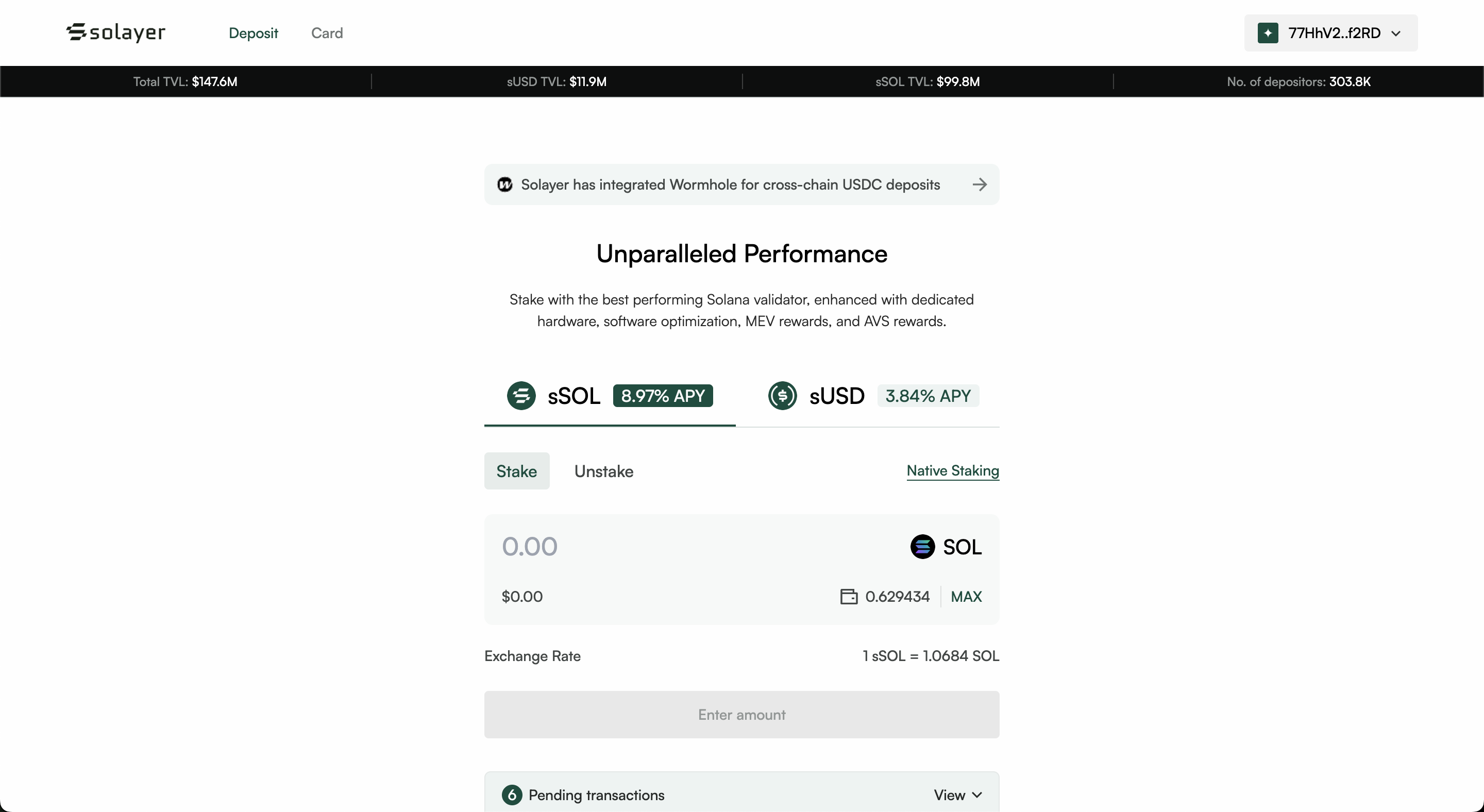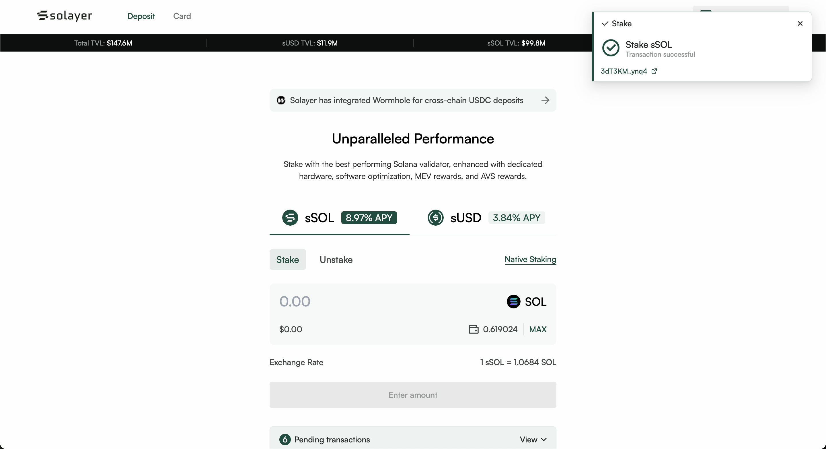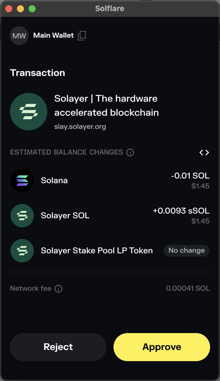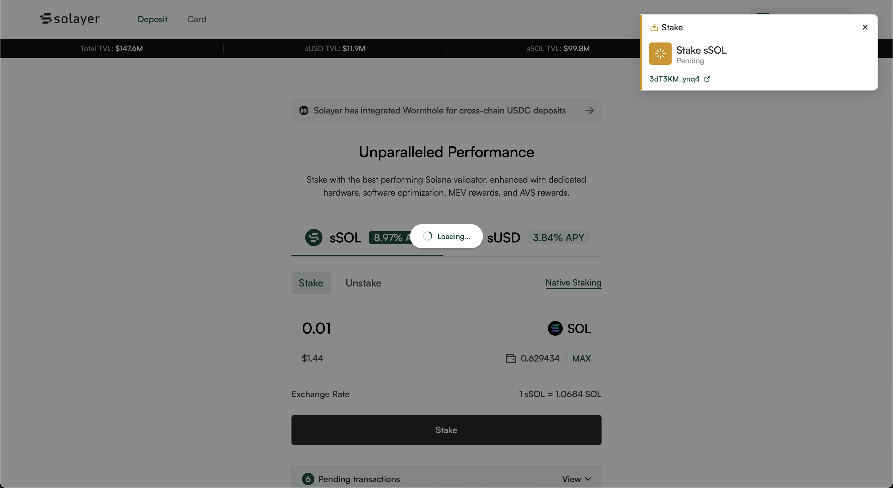 Once approved, a pending status will appear on the Solayer interface as the transaction is processed on the Solana network.This typically completes within a few seconds.