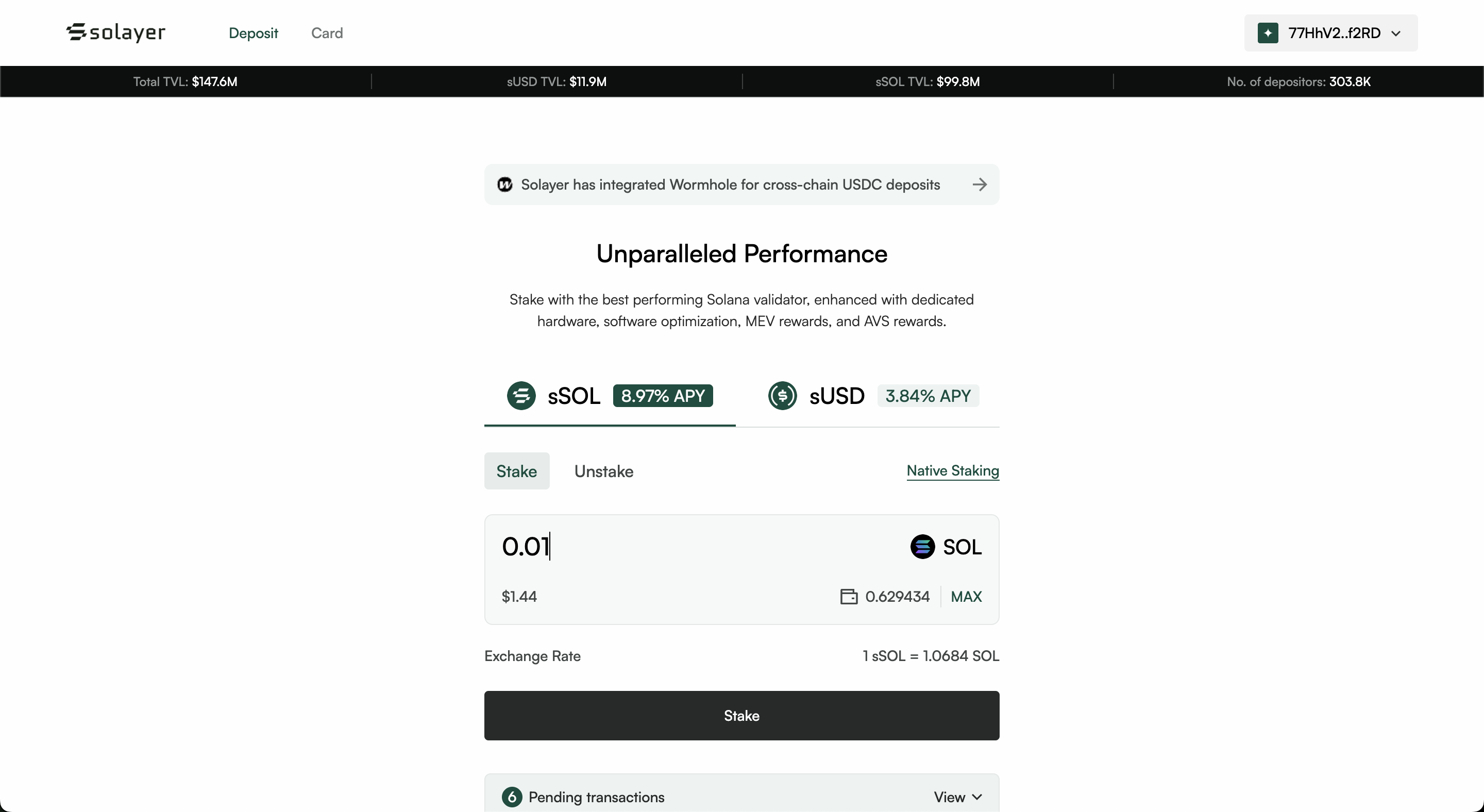 By staking SOL to sSOL on Solayer, you are participating in a secure, performance-optimized staking protocol with competitive APYs.To explore more features like unstaking, sUSD minting, or advanced delegation, visit our platform at app.solayer.org. For further questions, reach out via the Solayer Discord Support Channel.